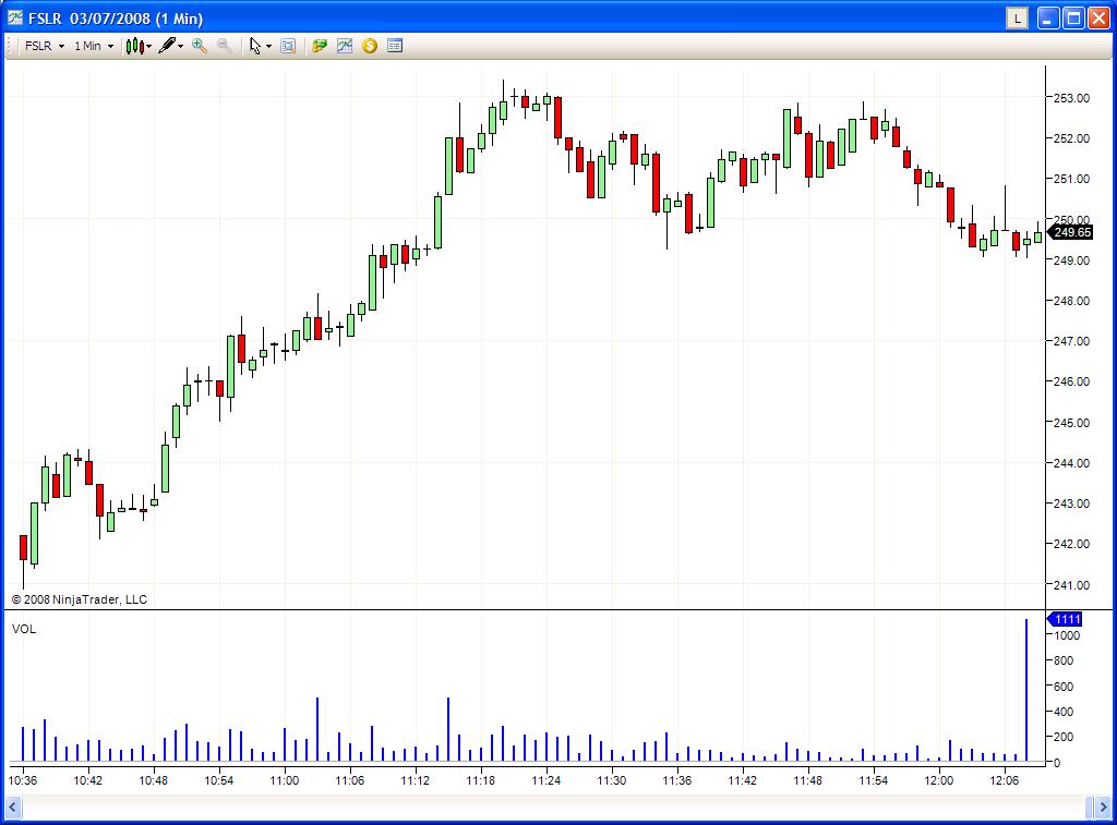 To illustrate, I have created a new 1-min chart on FSLR with NO indicators - just volume and the price.