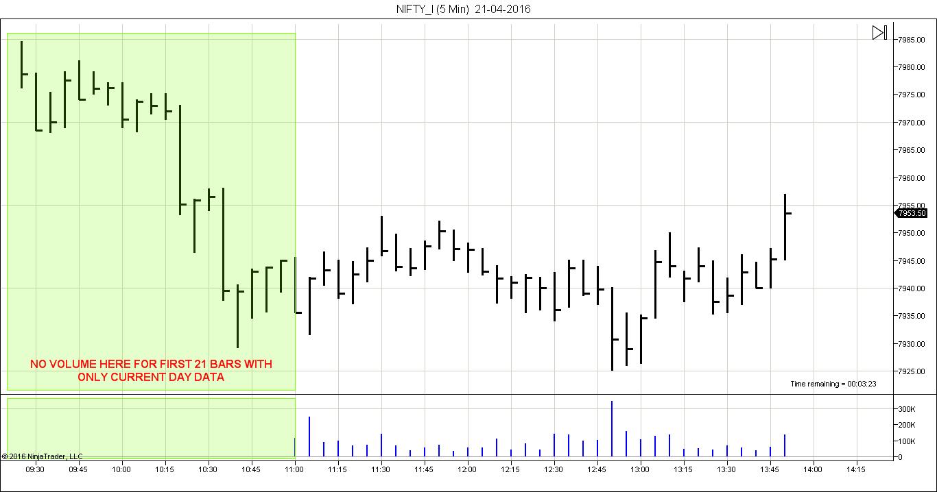 I am using only current day data on chart in NT7(5 minute time frame). Now the problem is when I put volume indicator on chart, it does not show volume for first 20-21 bars.