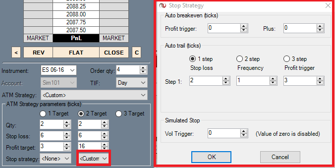 You'll want to set a 2 Target ATM Strategy. Each target will have a quantity of 2. The first target has a stop loss of 6 and a profit target of 3.