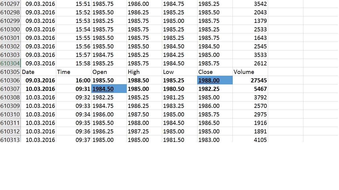 My Excel sheet has a Close on the 9th at 1988, while my chart has a Close at 1979.