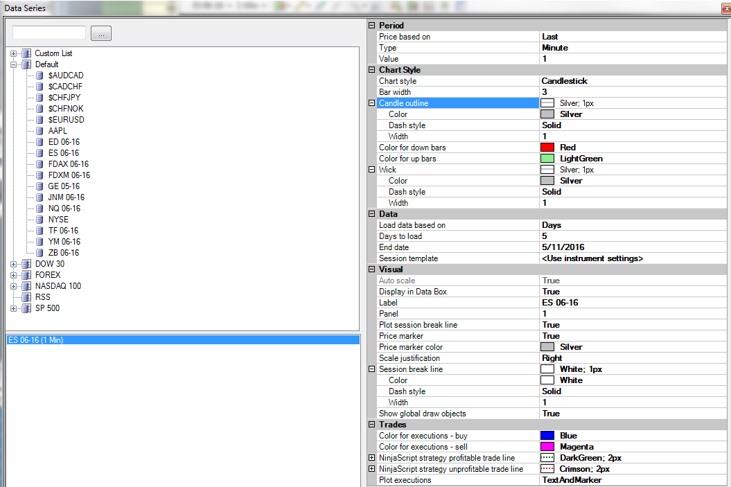 Next you will want to alter the data series colors, right click on the chart and select data series. Here we will be altering Candle outline, Wick, and Price marker color.