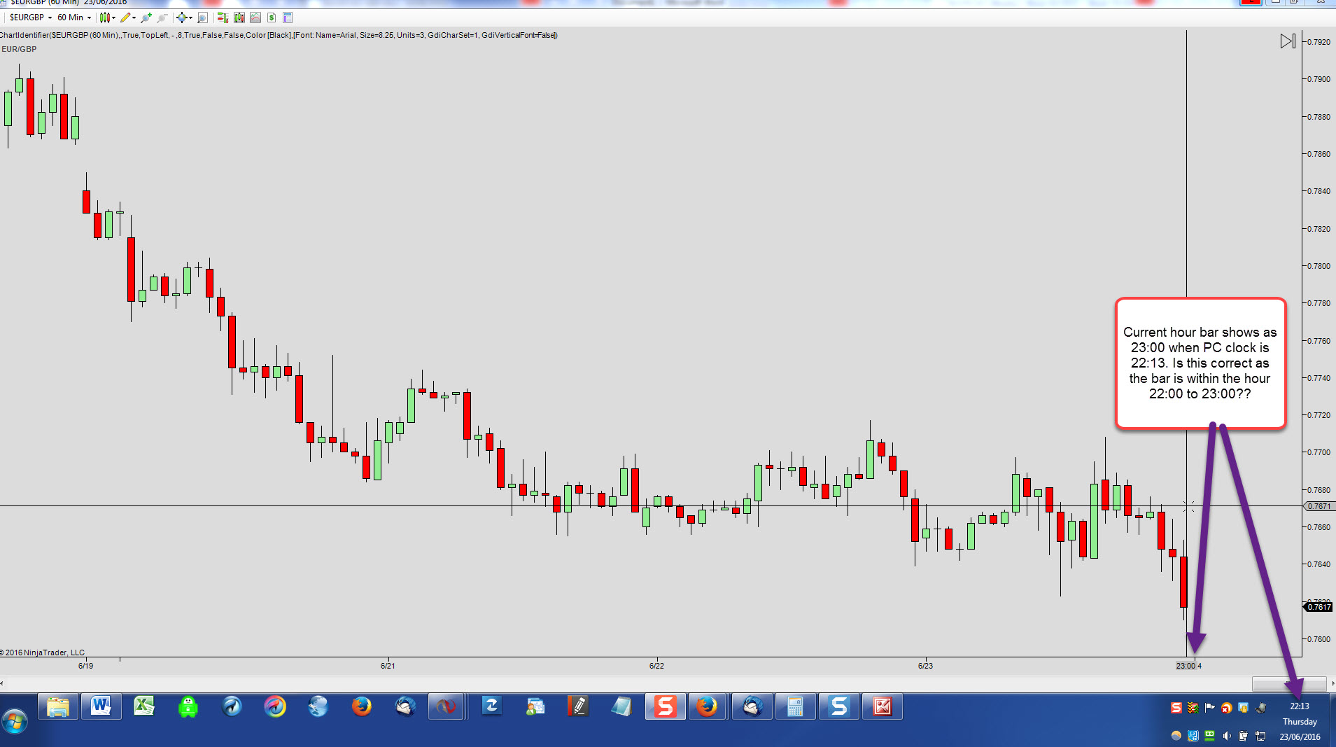 Example is shown in attached screenshot where current ''incomplete'' hour bar shows time as 23:00 but my PC clock time is 22:13. Should the current ''incomplete'' hourly bar time be 23:00 or 22:00?