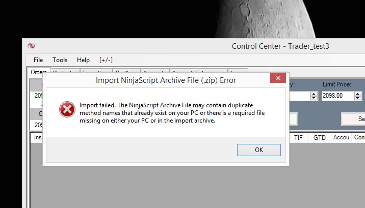 But something's still wrong - I can't install new indicators - see the attached .jpg of the error message. Also, thinking a clean reinstall might fix the problem, but when I tried to reinstall NT (download, select 'repair NT', etc.) the install doesn't run (message: "The specified account already exists").