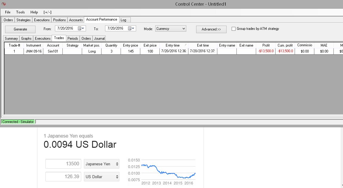 What is occurring is NinjaTrader is displaying the PnL in Yen, although it has a Dollar symbol.