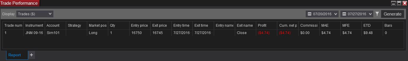 I did a sim trade using 3 contracts which took a 9 tick loss. The instrument is supposed to be ~$5 per tick, therefore I expected to see a 27 tick loss or $135.