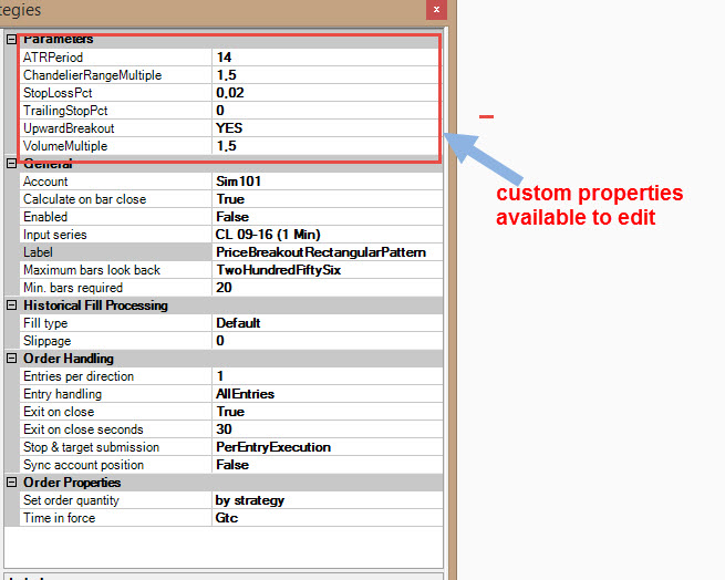 I just implemented a custom strategy. I use some properties to customize on "Strategies" window by user. And when I implemented such properties in the script I can't see them on "Strategies" dialog.