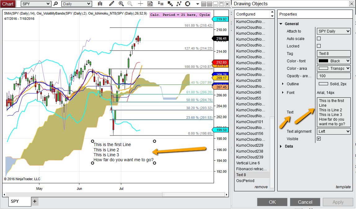 In the NT7 text entry tool, you could hit a return and get a new line. Sort of annoying if you have a lot of text on your charts, like I usually do, but this was pretty workable. Perhaps I don't like change that appears to take me backwards, but having to enter the text in one line, as NT8 Beta currently requires, and then having to edit the format of that text in another operation, is even more awkward than it is in NT7. I would think that such an advanced charting package as NT8, that it would have solved the text entering issues associated with NT7. That is, NT8 should have an auto text wrapping feature like all current text editors seem to have these days. I like to annotate many of my daily trades, and NT8 Beta has made text entry more of a chore compared to NT7. Nice if this lack of text wrapping feature could be fixed soon. Not asking for a word processor, just a wrap-able text box. The current NT8 Beta implementation for sizing the text box is a bit cumbersome.