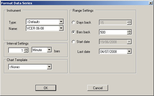 Setting the "First date" to 30/05/2008 and "Last date" to 30/05/2008 works fine. (However with "Bars back" didn`t work )