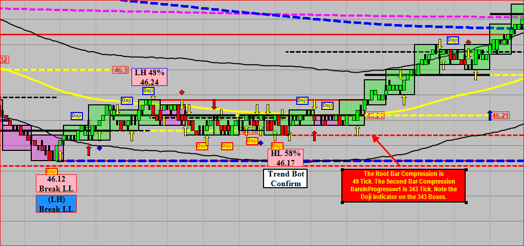 Thanks for Responding. This is an issue which we touched on before where I had suspicion that BarsInProgress was not being processed properly. Essentially because my Root Series and Secondary Series etc are all multiples of each other and my code assumed the lower TF was completed and processed first, I was experiencing issues with my code where Things were being missed that should not of been. So Fast forward to tuesday where I put a Doji indicator on The primary 343 Tick series of one chart and a Similar Doji indicator on a Secondary Series which was 343 Tick and to my suprise on that tuesday I was not seeing the same Doji's on both charts. The 343 Tick bars were clearly out of sync and they didn't close at the same time. So there respective Hi's Lo's , Opens , Closes were all skewed. My Code is not yet ready to turn into a strategy. It is still an indicator but with a Strategy in mind. My BarsInProgress is processed as a Switch(BinP) with Case Statements to keep everything properly in order. I will set it up with the same framework to eliminate all my code with the exception of the Doji. I can't do that until this weekend. When the sync misfires next time I will also get pictures and send them as well. I don't really see how its possible that it is my code. Also I have posted some pics of the two charts. One looks expanded because it has the root 49Tick series. The other has a Root 343 but the Doji's are both on the 343 Tick. The boxes in the Background on 49Tick chart are an outline of the 343 Tick bars. This along with the Doji's is how I knew they were wrong. They are correct however on these pics.