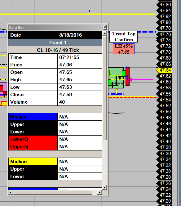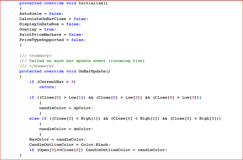 This example was done with replay. Note the last Red candle. The body outline is High 47.65 Low 47.59. Now look at the data box which is set on this bar. If I reloaded it would reset to what the data box indicates. See attached after Reload. Now possibly I am making some consistent error in my code. I also attached the code for the candle bar coloring. How do I fix This.