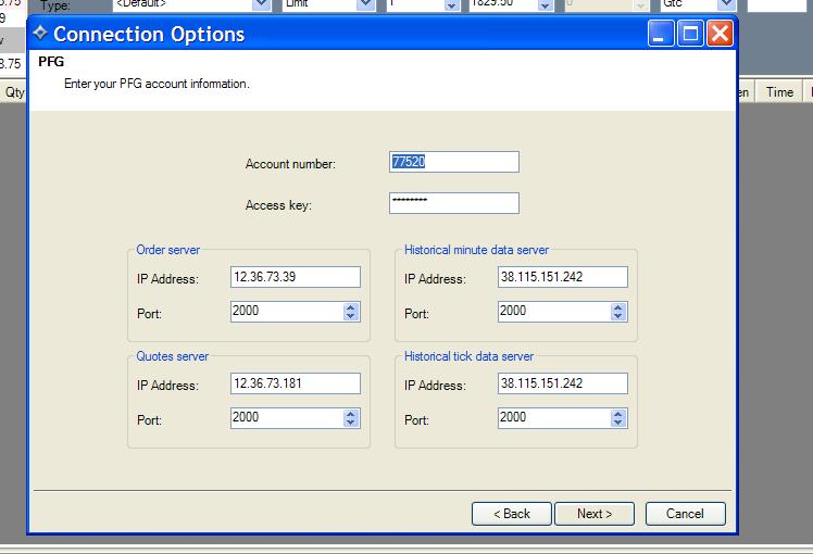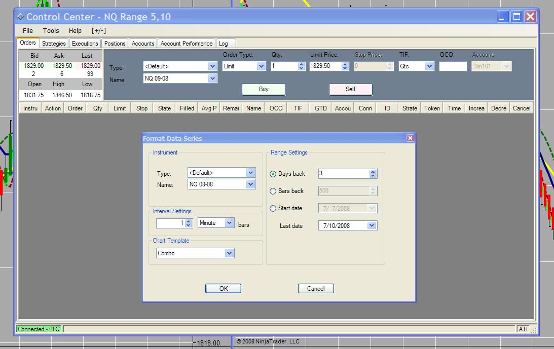Then something odd caught my eye. Down in the lower left hand corner the data connection was indicated in red "Connection Lost- PFG server". This was interesting as data was currently coming in just fine for all Globex markets. Charts were updating and my market analyzer with TimeLastTick was updating just fine. Hmmmm. Out of curiosity I decided to shut down the PFG data connection and of course all data stopped. I then tried to reconnect the PFG data connection but the program wouldn't let me because the PFG label under FILE>CONNECT was still greyed out. Still in the experimental mood. I shut down NT completely and intentionally waited about 20 min. before rebooting NT. The PFG connection started right up no problem and the lower left hand corner showed in green Connected-PFG as usual. As per my theory- there is no backfill, sure enough there was a gap in data for the 20 minutes obvious by viewing a one minute chart. The trading activity is sufficient as this time of morning 7:20 AM to be very sure of this. This was for symbol NQ 09-08. I went through the usual routing of trying to reload the data via tools>historical data and this as usual had no effect.
