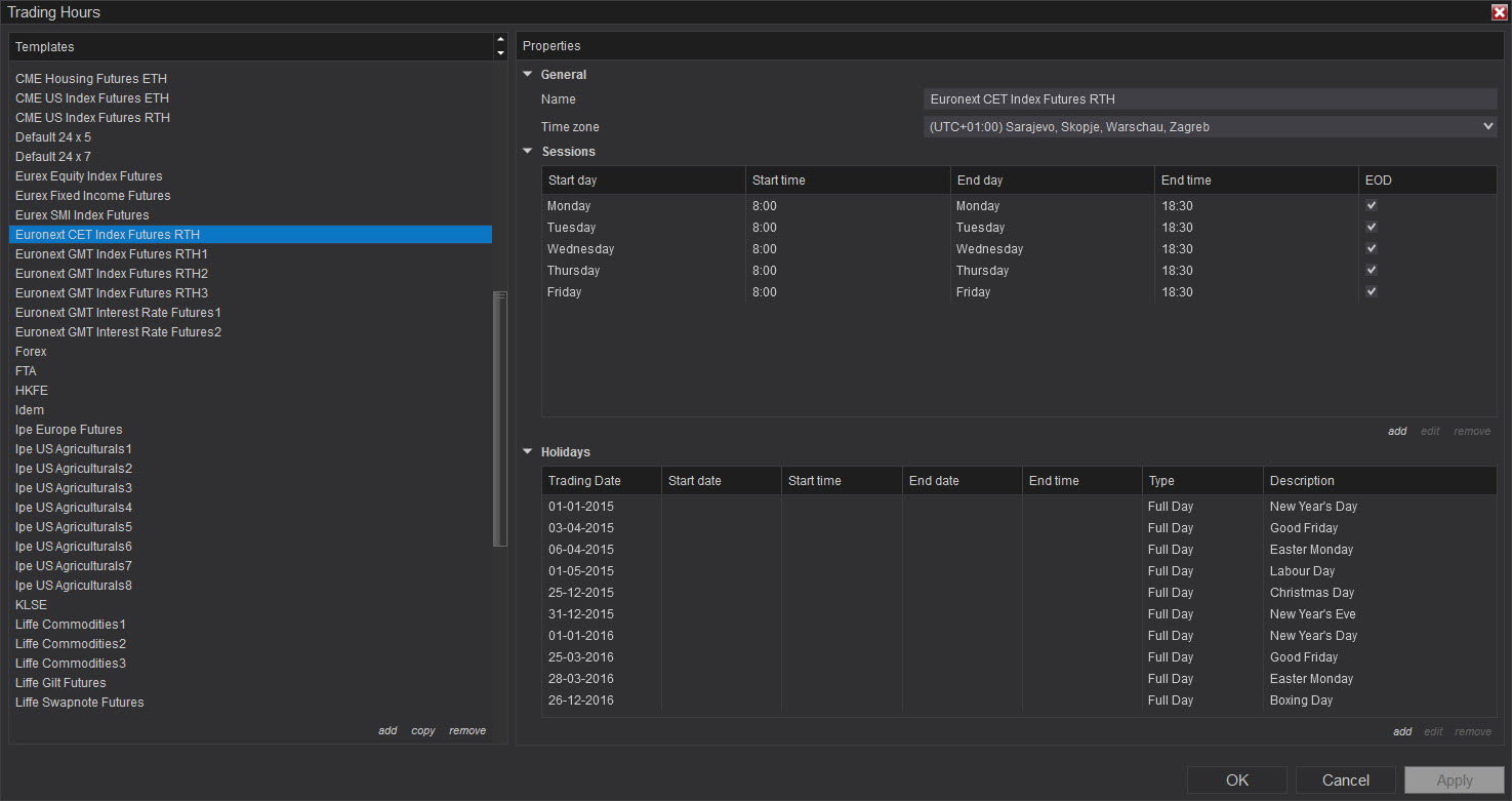 how may i change the starting hour / ending hour + start day / end day for the week timeframe charting in NT7 ?