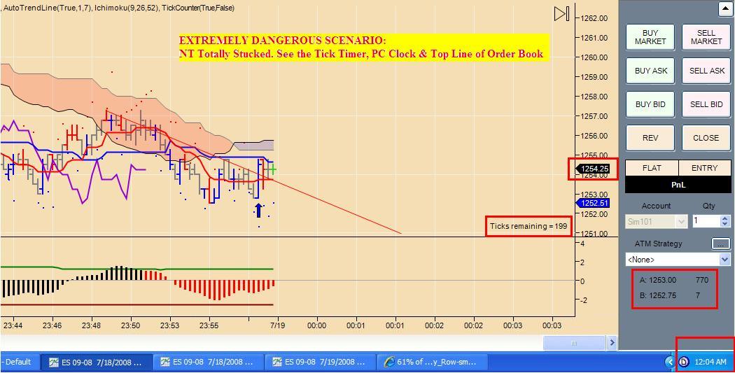 This matter requires your urgent attention. Tonight while trading ES on NT, I realized that NT got stocked completely. I usually trade from chart and it was only due to the fact that I had an open position in ES, that I came to know that NT Chart Data display has got stucked completely, in the sense that I could luckily manage to close my open position by buttons on the RH side of the chart space as I can see the top lines of Bid/Ask from the same area, but absolutely no bar updates on the chart were observed. I happen to sense this problem before also where the price bar tends to remain unchanged for quiet a longer period of time, say about 3 to 5 minutes and then what I can call as JUMPS once it is restored giving a shock to the person witnessing it. I happen to assume initially that may be large transactions were going on until tonight when i actually got caught in this scene and I have to make my conscious admit that, IT IS NOT LARGE TRANSACTIONS MAN, YOU ARE ACTUALLY OUT OF THE MARKET. So in short, what I have witnessed could cause a tremendous lack of confidence in NT-Paid Subscribers as me because I hold tremendous respect and belief in this wonderful trading platform. Now, let me tell you what I did after this happened.