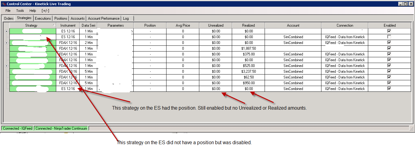 Neither strategy received an OnPositionUpdate event – no entries in my strategy logs. Even though the strategy which opened the position now reflected no position (Unrealized and Realized both zero) and the strategy was still enabled.