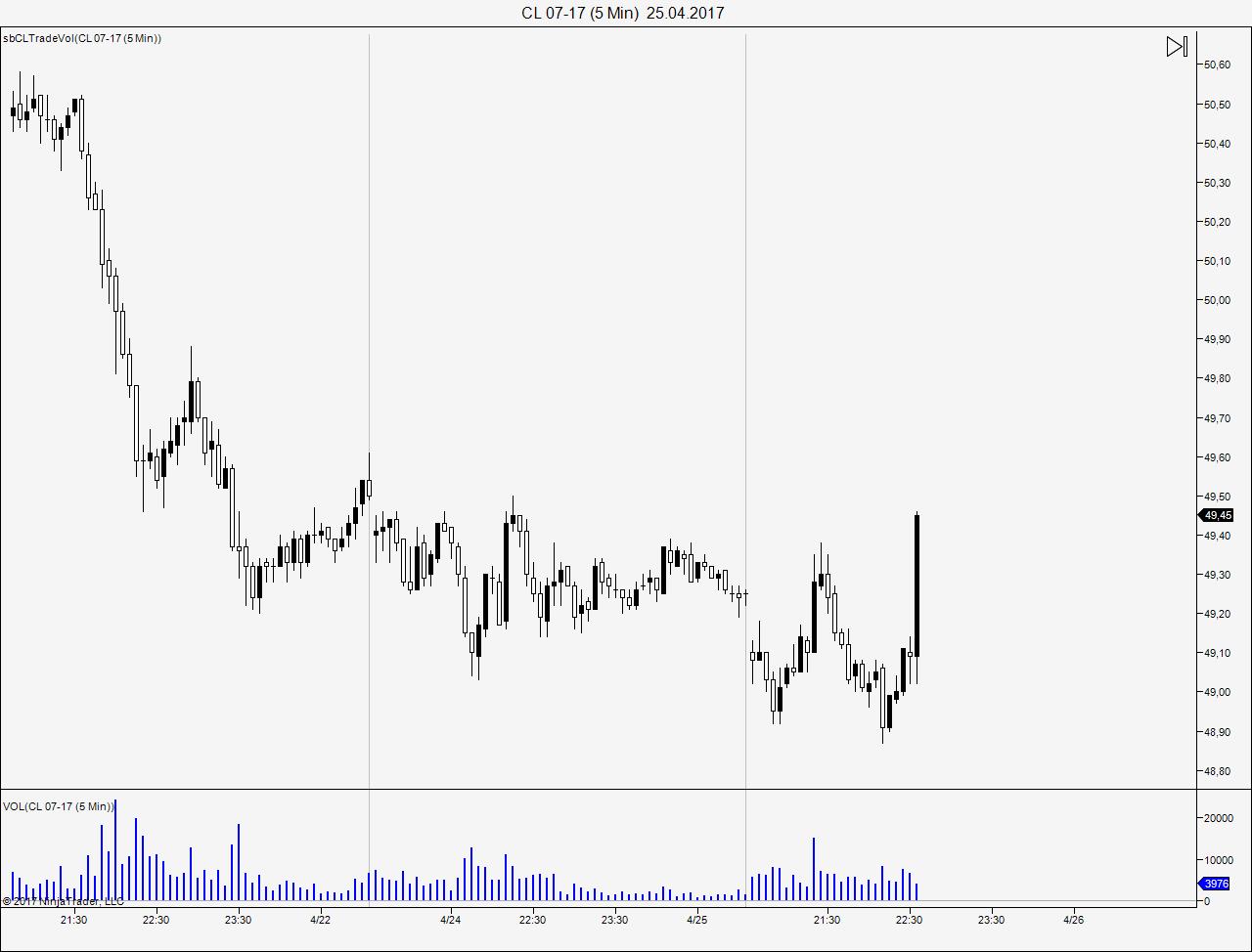 The reason you are receiving the large bar is due to the contract month and merge policy. The current contract month is CL 06-17 and you are viewing the CL 07-17. If you would like to View the 07-17 contract you will need to change the merge policy. To change the merge policy please go to Tools > Options > Data > Merge Policy > DoNotMerge to receive the correct data for the CL 07-17.