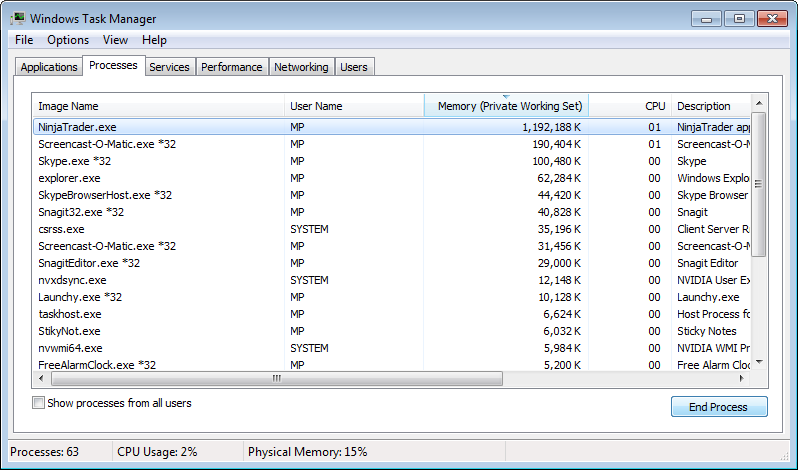 I have one workspace open which has 12 charts using several indicators. As you can see from the attached NT is using a lot of memory. Is it possible to somehow determine which indicator/chart is using up all the memory?