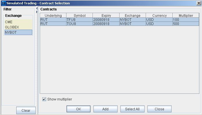 OK , I contacted IB and double verified that " RUT " is the correct symbol forOriginally posted by T2020 View PostYou enter "RUT" > than select Futures Sept.08 > Select "NYBOT" and you have a choice between a 100 and a 500 multiplier . The 100 is TFU8 .All you