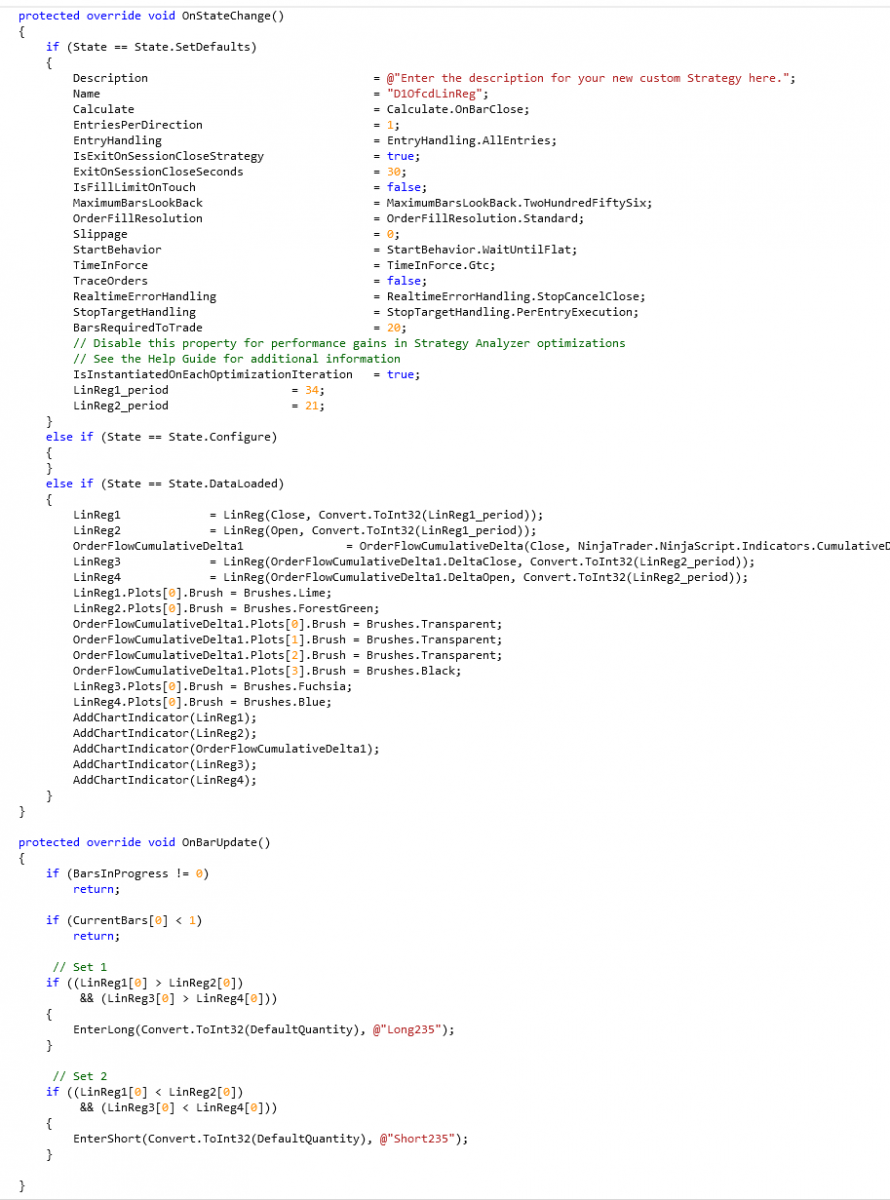Hello - I am trying to nest OFCD data inside a Linear Regression Line - is this possible with a strategy? It is very easy to do with an Indicator and the Strategy Builder lets me do it as well. However, the Strategy Analyzer won't run it. Any suggestions? Here's a picture of the code. You can see LinReg3 = LinReg(OFCD, bar, DeltaClose) and LinReg4 = LinReg(OFCD, bar, DeltaOpen). Any help would be appreciated. Thanks!