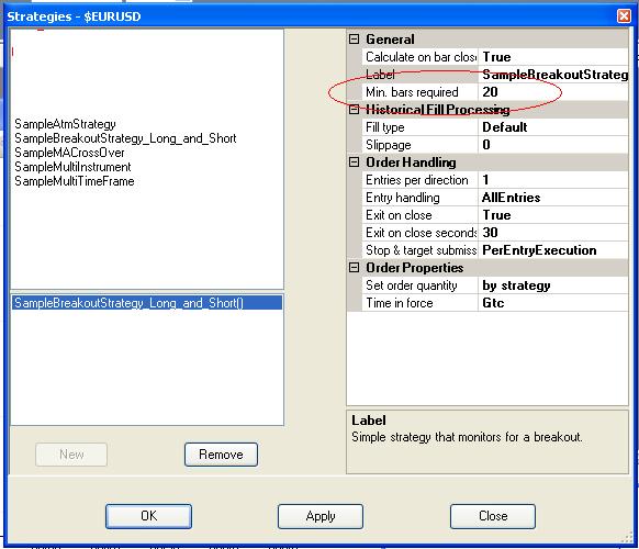 • I used replay data of a single day for testing. In the strategy setup table I set Min-bars-required to 0, otherwise I would have missed the if-(Bars.FirstBarOfSession)-section of your strategy. I removed the if-(CurrentBar < 10)-command from your code for the same reason.