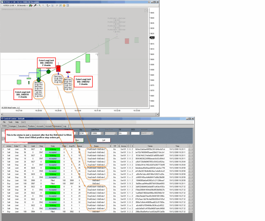 The first bracket orders are filled. The profit orders are filled and the stop orders are cancelled by NinjaTrader (not my code).