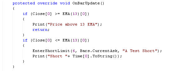 I ran this with the Simulated Feed again today. This is only happening on my machine. I used another's computer, ran the same program and it placed orders in the DOM. I have saved the log and so forth. And no, the order is not actually submitted. It shows on the chart after the fact, but not in the log or any other areas to show the performance. It does appear to be running in the "Strategies" tab of the control center and showed the average price and unrealized profits.