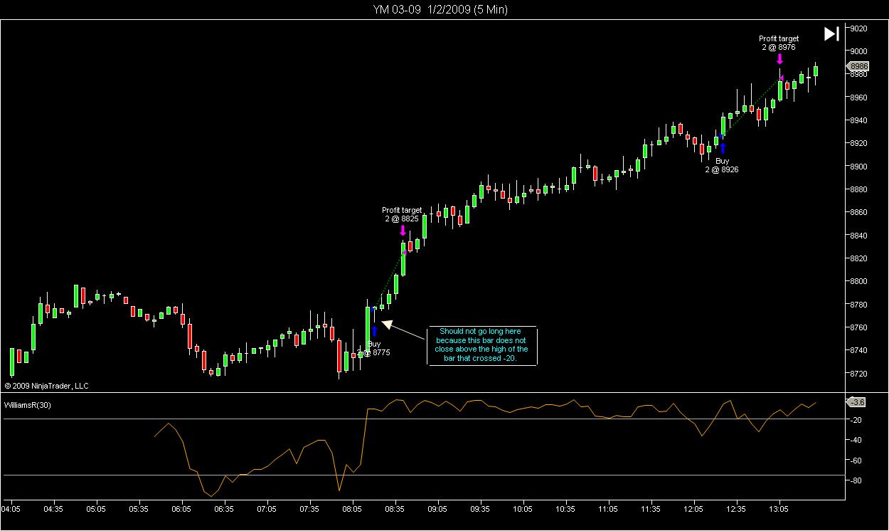 I am trying to create a strategy that when WilliamsR crosses above -20.5 and then if the following bar closes above the high of the bar that crossed -20.5 : I want to go long on the end of that bar. Using the strategy wizard, I created a strategy. I used "cross above" Williams R -20.5 and I input 1 bars ago. I then used Close (0 bar ago) > High (1 bar ago). However, the strategy is just going long on the first bar that closes above -20.5. It is not looking for my confirmation. I have played with the Bars Ago section on the Williams R and the Close/High pieces for hours now to no avail. Please Help. Thank you.Tags: None