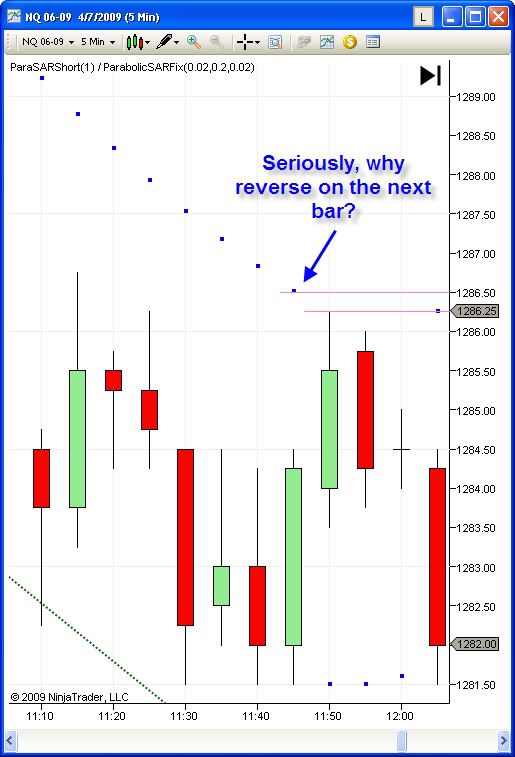 I have to say automated strategy development using the Parabolic SAR and stop orders in NinjaTrader is the most maddening thing I have ever encountered, and I got to say taking General Relativity as a grad student was no picnic either, but I am about this close "" to giving up on NT.