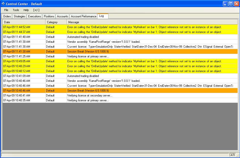 Josh, are you saying the problem is "Error on calling the 'OnBarUpdate' method for indicator 'MyHeiken' on bar 1: Object reference not set to an instance of an object." highlighted in the log file?Originally posted by NinjaTrader_Josh View Posttjendra,