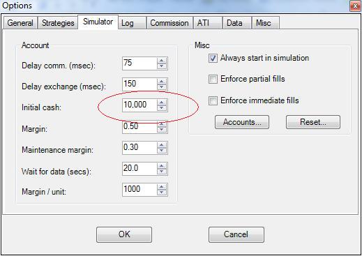 Unfortunately, I am getting an account size of 0 when testing. I’ve checked this setting in the Control Centre -> Options -> Simulator (Initial Cash) where I assume this number is obtained – see screen shot. It should be starting with AccountSize equal to 10,000.