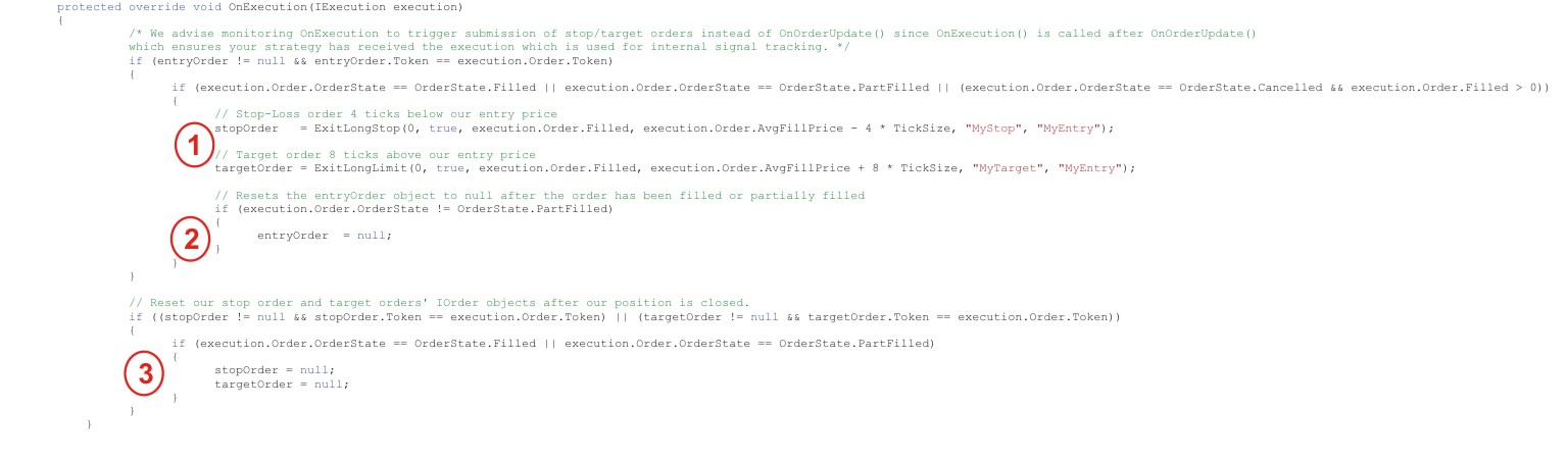 • Now the remaining 4 ENTRY contracts are filled. We therefore reenter OnExecution, and as the code stands at (1), we will inadvertantly overwrite the stopOrder and targetOrder references with new ones for the latest 4 entry contracts that have just been filled. (Remember those variables were deliberately not nulled previously, because the target exit order only received a partial fill of 3 contracts.)