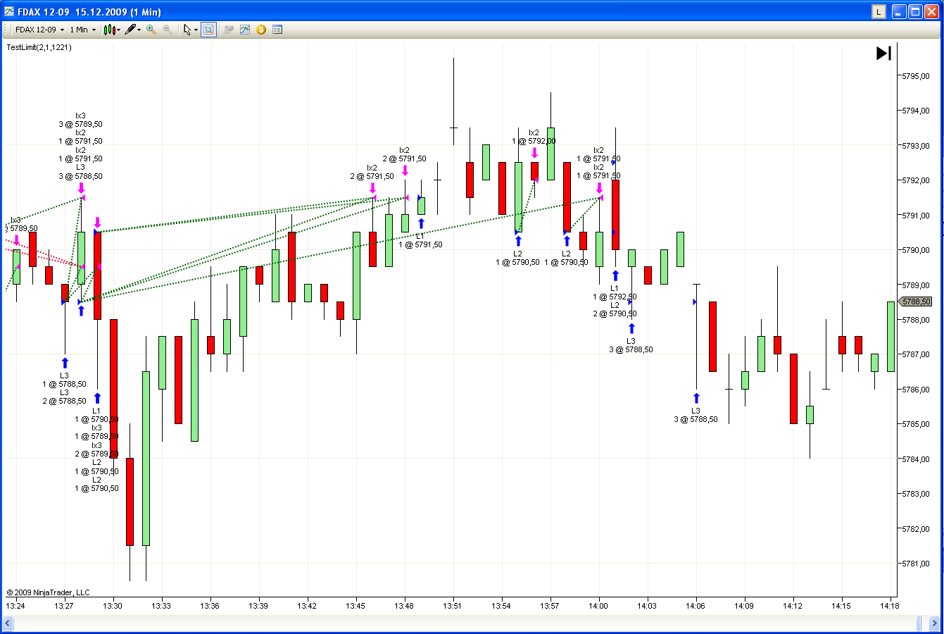 I have a simple test strategy which defines three limit levels with a profit target for each level. To my understanding the maxumum number of contracts this strategy should buy at once is 6 (1+2+3), but somehow nine contracts get bought. In this particular case that happens after the limit L3 gets executed twice at 14:01:09 and 14:05:06.