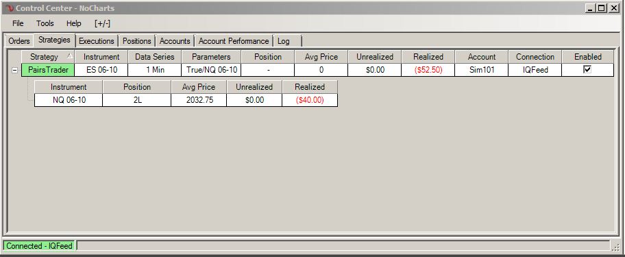 I've been working on a NT7 Strategy to trade pairs/spreads and have reached the limits of my current coding ability. Attached please find Strategy NinjaPairsv1.00. It works for daily bars in backtesting, but seems to have issues if you try minute bars.