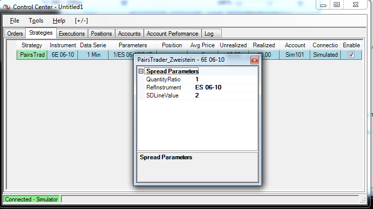 You should consider taking a look at this code instead of the earlier code I posted. It uses an updated version of the SpreadZScore indicator. Again I'm not looking for a money-making idea with this code, I'm looking for code that will execute long and short positions in different instruments reliably. It is not there yet...