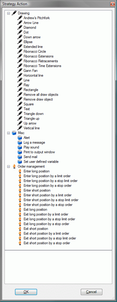 I have attached a screenshot of some of the prebuilt actions you can do when conditions are true. You can draw dots, arrows, send yourself an email, alert with sound or text, etc. You're not limited to these items, but these are the ones available through the strategy wizard.Ryan M.NinjaTrader Customer Service