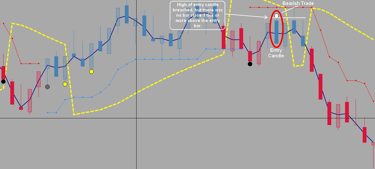 See attached jpeg file for visual reference. The initial stop upon entry is "15" ticks. If the price is 1 tick or more above the high (in a bearish trade), but does not have a bar close above the high of the entry bar, the stop adjustment would not be triggered.