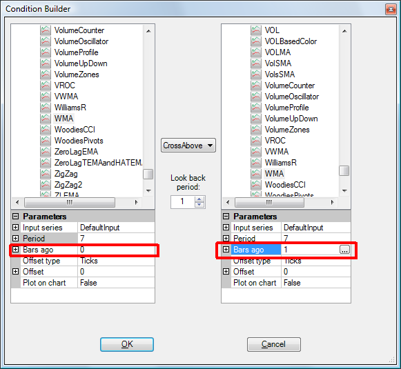 The screen you attached does not indicate if barsAgo was specified. Can you post a screenshot of your condition builder?Last edited by NinjaTrader_RyanM1; 09-02-2010, 11:36 AM.Ryan M.NinjaTrader Customer Service