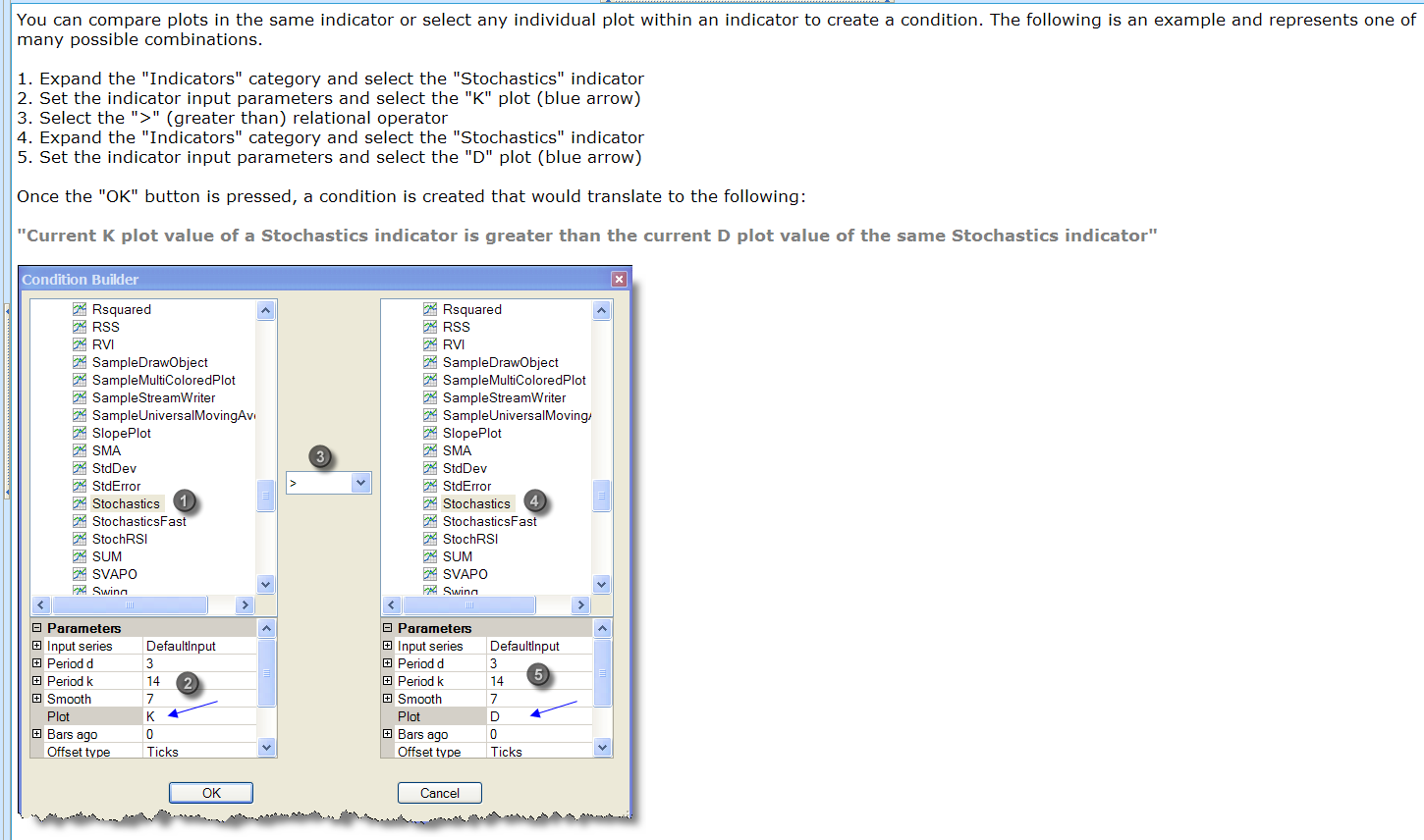 1: I will use the Fast Stochastics indicator and need to condition in the Condition Buider that %K > %D for a entry long. Because these variables are part of the same indicator I have no idea how to do this.