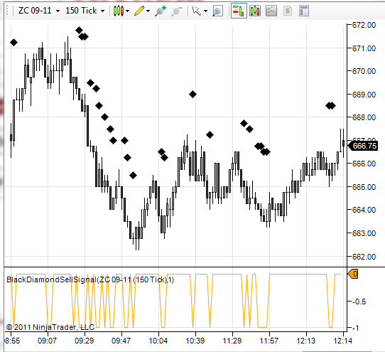 My indicators are based on conditional statements, and when they are met then the current bar is marked with a diamond above or below the bar depending on if it is a buy or sell signal.