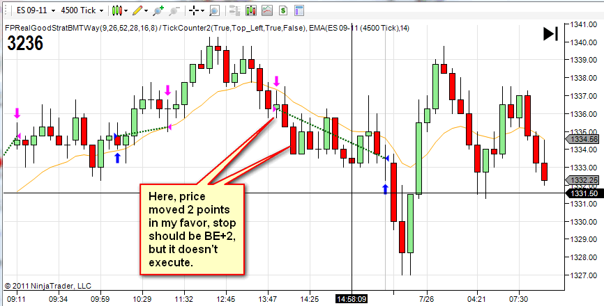 I have a different question about my stop loss. At one point I move my stop to BE+2. I would expect the trade to exit immediately once price touches that stop loss point. But it actually doesn't trigger till price moves through it one tic.