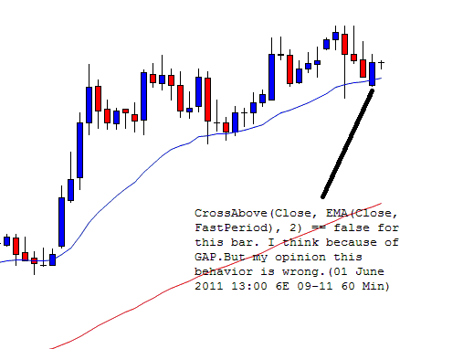 ALSO i really don't understand crossabove and below logic too. Suppose i want to enter long when price fist must be over EMA(21) then must be fall under EMA(21) and if again rise and go above ema21 I want to go long. So simply, i have to define some flags and control EMA21 and close price series cross actions. But at this time suppose price 1.2020 ema21 1.2018 then next bar price do little gap and open new bar at 1.2016 this stuation crossbelow returning false. WHY?
