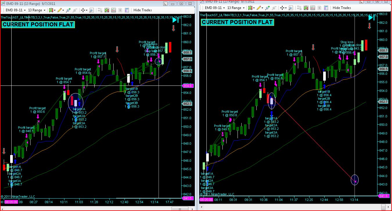 In the attached chart I have the same trade Historical (left) and real time (right).