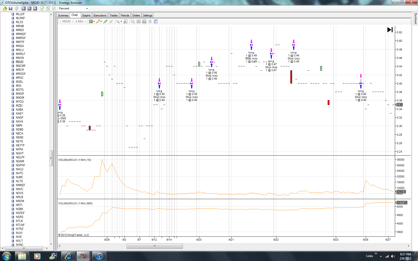 Then, I took one simple instrument that I knew went to the Price range (changed from percent to price) I input, and got bizarre results. See chart and the code below. All stop out and most of them at the same as teh entry price.