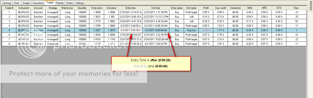 This is a shot of the back test results showing an entry time of 8:56:28 AM which is the timestamp of the entry bar on the secondary bar series. (timestamps are close of bar, the open of the entry bar is at 8:37:04)