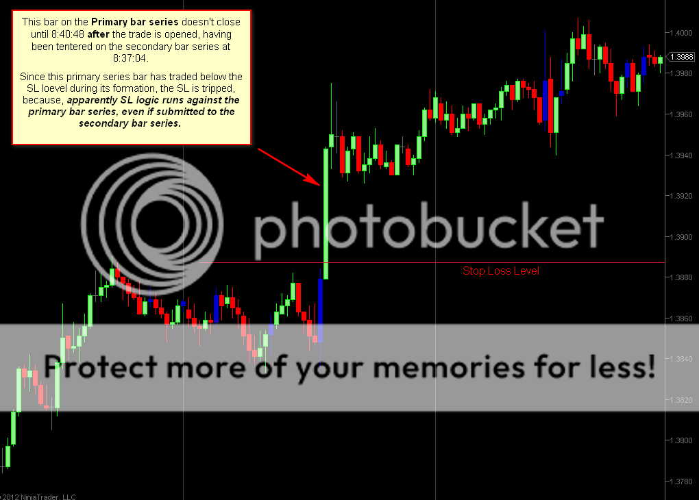 This is apparently made possible because the entry bar on the secondary time series Opens before the primary bar series bar closes. Secondary entry bar Opens at 8:37:04, where the primary series bar closes at 8:40:48, with the primary series bar having traded during its formation below the SL level.