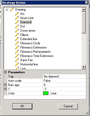 What I was trying to do is very simple: A fast Moving average crosses above a slow one, and I want it to place a drawing (diamond) in the chart at the cross over.