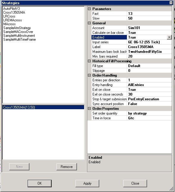 But every time I place and exit an order, it disables this strategy and I have to enable it again. That`s obviously quite cumbersome. I tried changing it from Order Handling, Exit on Close: True to False - but that does not handle it. I also changed Order Properties, Time in Force from gtc to All Day but that also did not change it.
