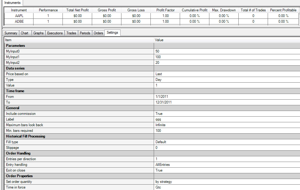 Now the only problem is I just tried to run a backtest on the NASDAQ 100 using this strategy on historic data and when the backtest finished running it showed all of the 100 symbols but all the stats just say 0.00 0.00 0.00 1.00 .000% etc. Why would this be?