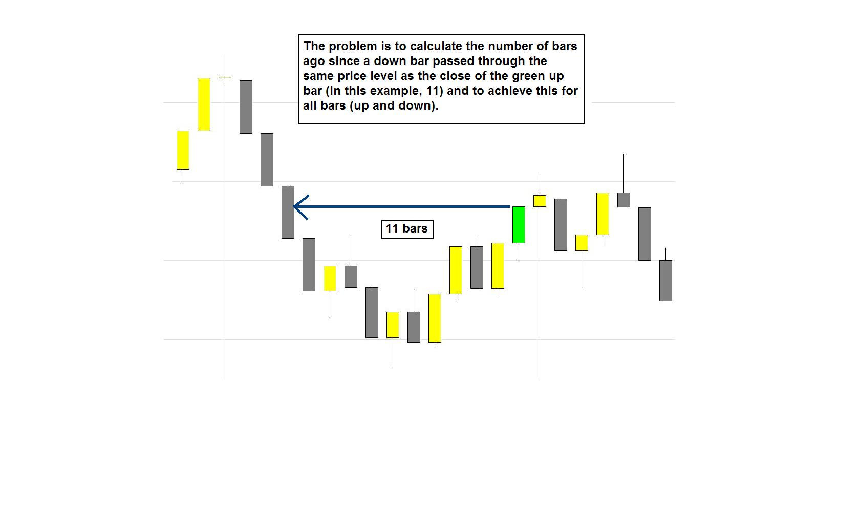 Firstly, I’ll restate the problem, which is to calculate the number of bars ago since a down bar passed through the same price level as the close of the current up bar (and vice versa). (Please see the graphic illustrating what I’m aiming for.)