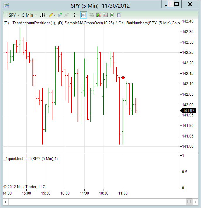 The result is shown in the pictures below, where you can clearly see the dot drawn. Look in the Output Window to see the text. Actually, when COBC is false, you can see the dot jumping around in real time as the current bar modifies the happening.