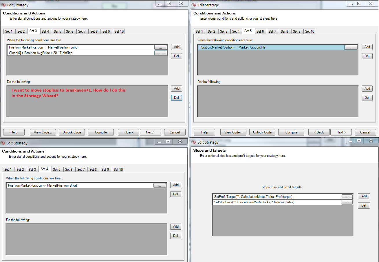 I have added a condition in the strategy wizard:when price is +20tick above Postion Average Price I want move my stop loss to Breakeven.